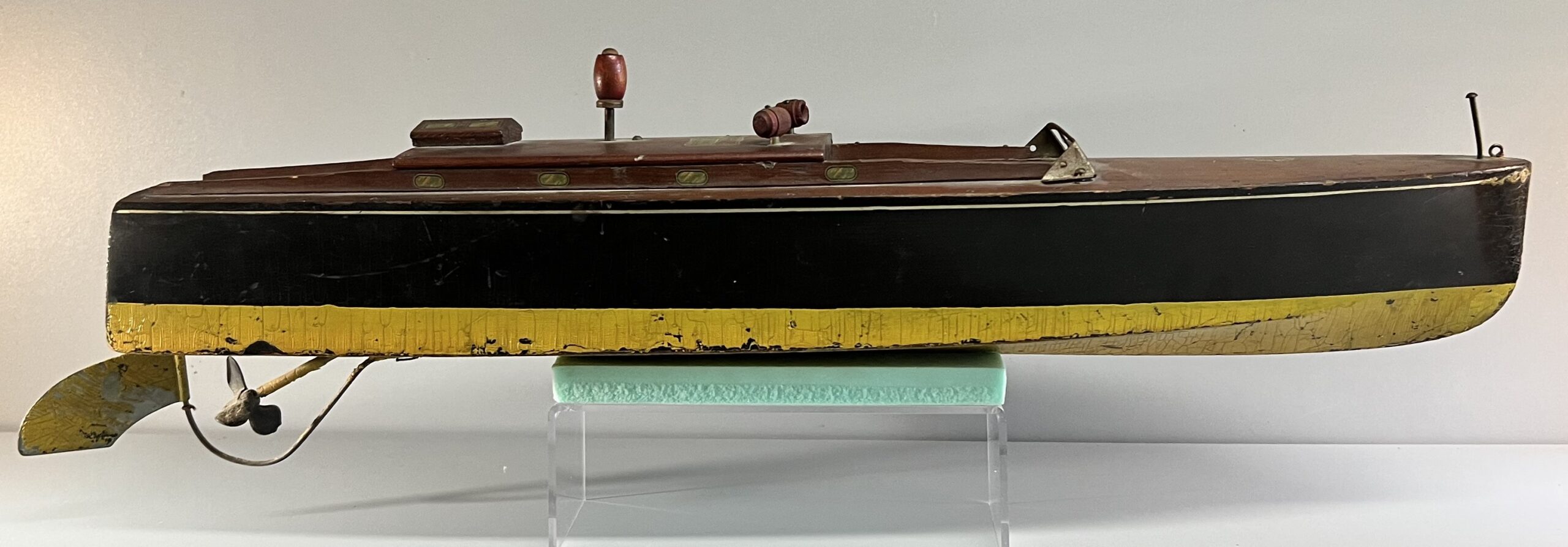 This is one of the larger versions of the Flying Yankee produced circa 1930. It is an impressive 27″ long and 6″ wide. The boat is powered with a wind…