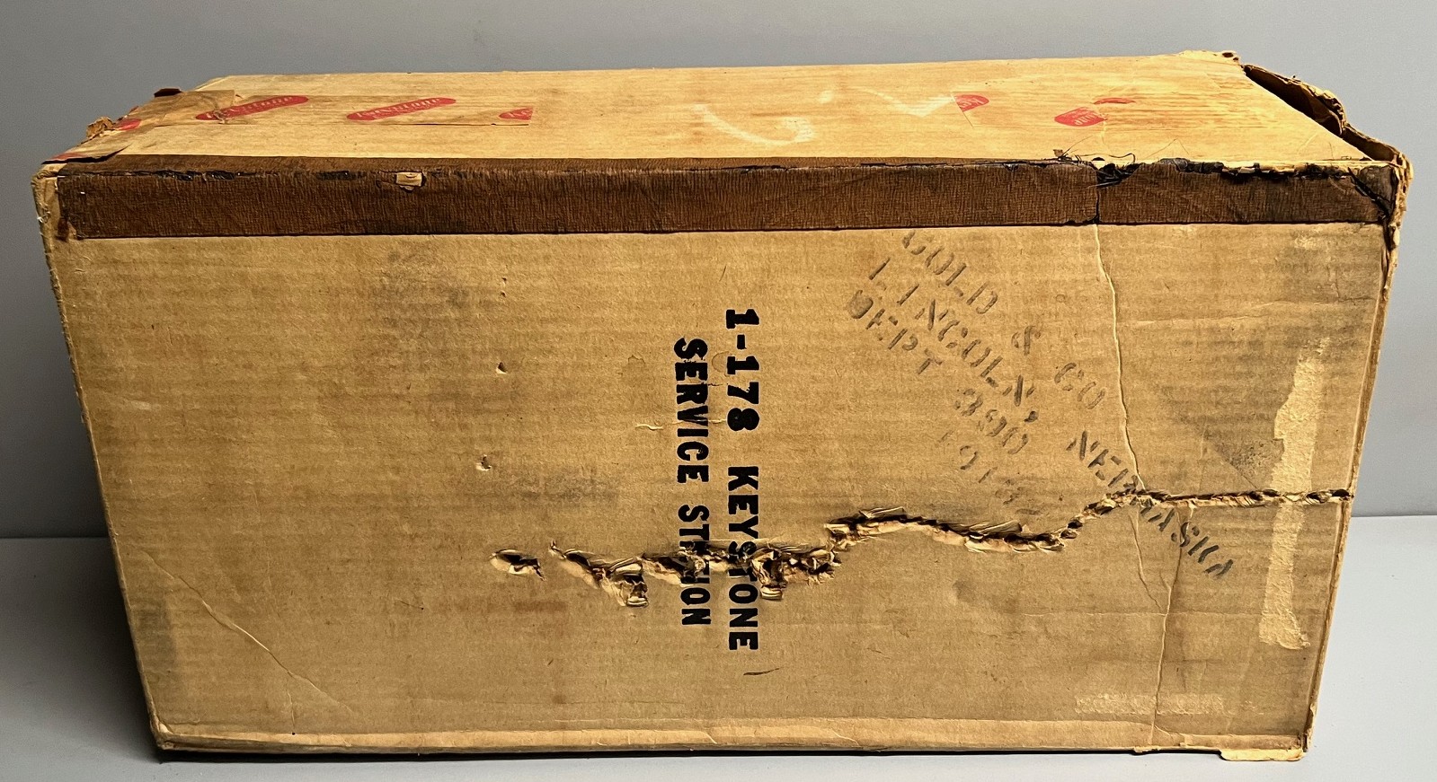 This station is 22″ x 12″ at its base and 8″ high. A child could give a car a wash at the station to the left or an oil change on the lift. The gas pump would also fill as car. All three used water which over time would damage the tekwood that the station was built out of. That is why condition is always an issue with these Keystone stations.