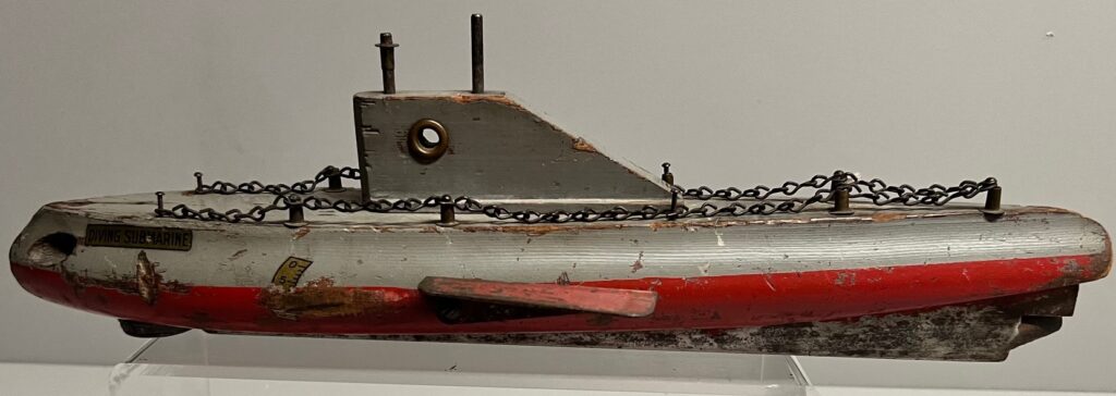 This is a rare submarine that appears in the 1933 catalog. It is 14.5 inches long. Wood body with a metal keel and a lead weight under the bow. The submarine is rubber band driven. The prop to attach the rubber band to is missing on this example. The fins on the sides are adjustable to set the depth of the dive. There would have been torpedoes with this sub as well but there is not a firing mechanism for them. There would have also been a metal flag on the bow. Ten years of looking for one of these and this is the first one I have seen.